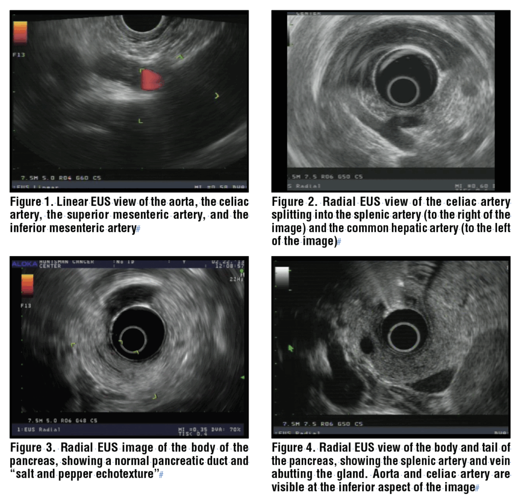 With the echoendoscope positioned just distal to the squamocolumnar junction, the abdominal aorta is readily identified by applying clockwise torque to the shaft of the scope. With the linear echoendoscope, the aorta appears as a long, anechoic structure, often with hyperechoic walls, sloping down from right to left across the monitor with the pleura of the left lung clearly seen below the vessel wall. The diaphragmatic crura are seen, and when the echoendoscope is advanced further, the celiac artery is identified as it is the first vessel branching off the abdominal aorta. The superior mesenteric artery is located just below it, and the inferior mesenteric artery is also easily seen below that. (Figure 1) The echoendoscope should be gently torqued clockwise and counterclockwise to visualize these structures.
