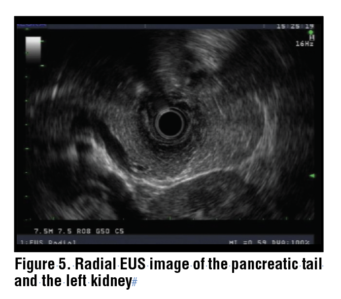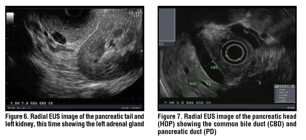 The body of the pancreas is identified by its characteristic “salt and pepper” appearance, as well as the presence of the splenic artery and vein. (Figure 3) The splenic artery and vein can be confirmed by pulse wave doppler based on flow patterns, and in general the splenic artery is narrower than the vein and follows a more tortuous course. In the body of the pancreas, the splenic artery and vein are seen as two anechoic circles, and the main pancreatic duct is positioned to the left of these on the monitor. (Figure 4) From that position, the echoendoscope may be gently torqued clockwise and withdrawn to keep the pancreatic duct in view and to scan the body and tail of the pancreas. During this maneuver, the left kidney is identified and acts as a guide to the demarcation of the junction between the body and tail. (Figure 5) The splenic artery and vein may be traced with further withdrawal to the splenic hilum and spleen. With minor counterclockwise torque, the left adrenal gland is also identified as a sprawling “longhorn steer-shaped” structure. (Figure 6)