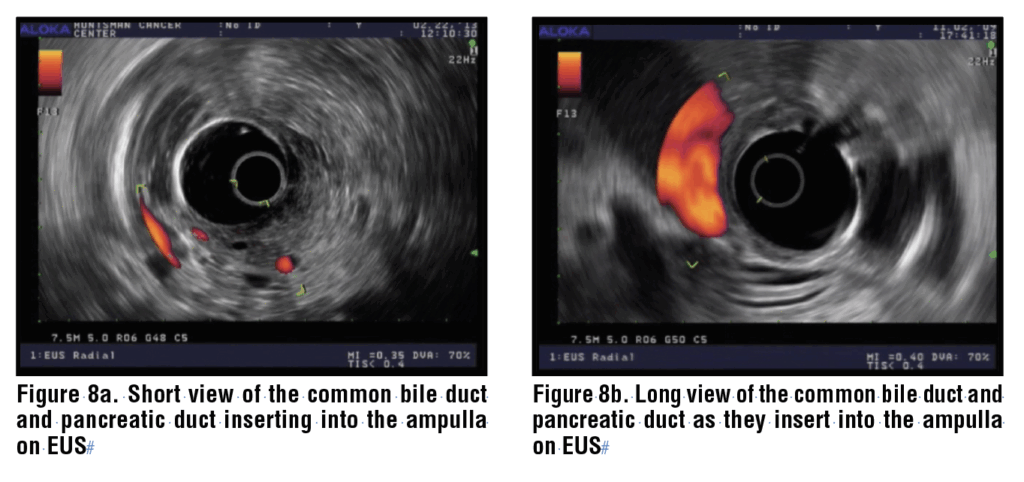 Once identified endoscopically, the tip of the scope is deflected upward such that the transducer is nestled perpendicular to the papilla. The transducer is gently rotated clockwise, and the ampulla with common bile duct and pancreatic duct in a linear orientation come into view. Anticlockwise rotation will allow the operator to look up towards the proximal biliary tree. The ampulla appears as a thickened, hypoechoic, homogeneous structure within the duodenal wall but projecting outward towards the lumen, with the bile duct appearing more superficial or close to the transducer (given the intraduodenal nature of the distal common bile duct), and the pancreatic duct deeper. (Figures 8a and 8b) The pancreatic duct and common bile duct may form a common channel is they enter the major papilla, or they may arrive with distinct orifices, each surrounded completely by sphincter tissue. The echoendoscope is slowly withdrawn and rotated clockwise and counterclockwise until the portal confluence is identified.