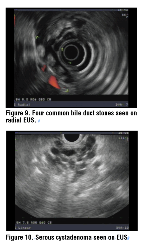 Among the most common indications for pancreaticobiliary EUS are suspected choledocholithiasis and solid or cystic lesions of the pancreas. The best location to identify stones in the bile duct is with the echoendoscope in the duodenal bulb. From this viewpoint, the portal vein and common bile duct are identified and can be traced cephalad to the liver and down to the ampulla. The view from the ampulla may also identify distal stones. Stones in the bile duct appear as round, oval, or triangular hyperechoic structures that typically have post acoustic shadowing. (Figure 9) Shadowing represents a disruption in the sound waves by a dense structure, causing a dark, echo-free image beyond the structure. Occasionally, soft stones or sludge will not create a shadow, but must be accurately identified regardless.