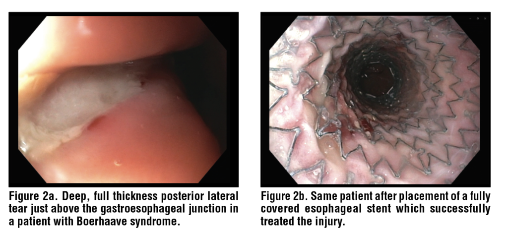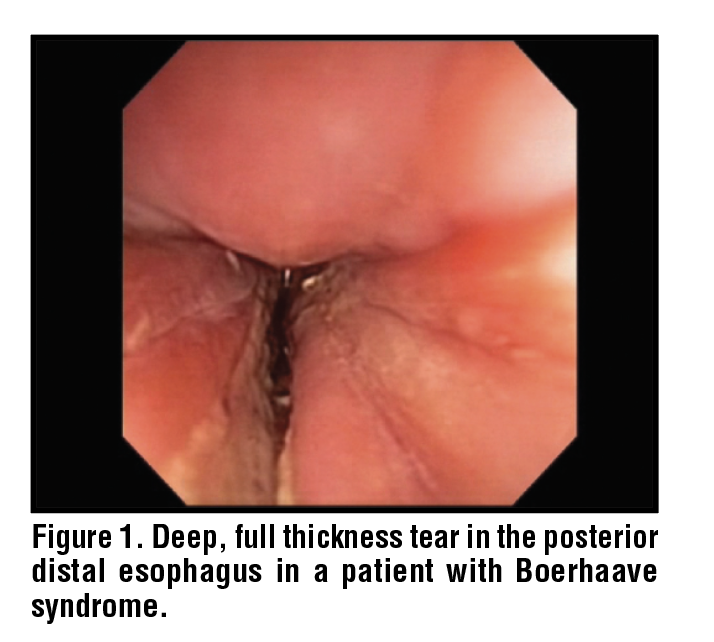 The sudden rise of intraesophageal and intraabdominal pressure against a closed glottis creates a severe pressure gradient across the mediastinum, where the intrathoracic pressure gradient is very low during retching. This, along with dyssynergia between the upper and lower esophageal sphincters, produces a wall stress that results in a full thickness tear – usually occurring along the left posterolateral distal esophagus at the level of the gastroesophageal junction. (Figure 1) Subsequent leakage of luminal contents into the surrounding tissue, if untreated, leads to sepsis, organ failure, and death.3,4