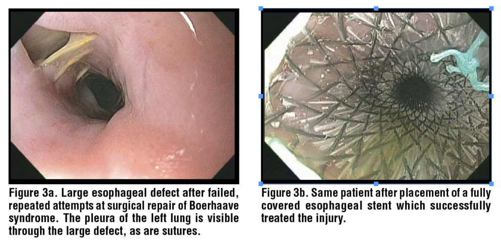Delayed stent migration has been reported as well with a case report of tracheoesophageal fistula forming after multiple stent placements, perforations, diversion, and gastric pull-up for Boerhaave syndrome.36 Another case of small bowel obstruction was seen in a patient with Boerhaave syndrome who was treated with a fully covered esophageal metal stent that had migrated to the jejunum.37