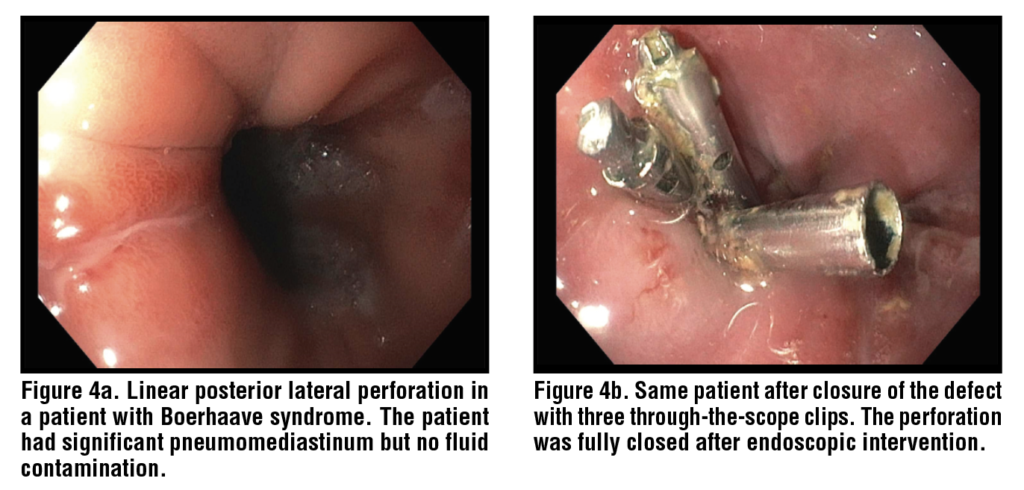 Clips in the context of Boerhaave syndrome have been used for many years. (Figure 4) They have a clinical efficacy of more than 90% in small (<1–1.5 cm), sharply demarcated perforations with minimal contamination.49 The defects in patients with Boerhaave syndrome are often large with edematous, and may have necrotic ragged edges making them difficult to be approximated by OTSC.