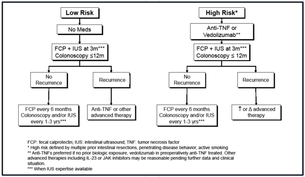Importantly, early endoscopic remission does not guarantee subsequent remission. Up to 50% of individuals with endoscopic remission on their index postoperative colonoscopy can experience disease progression regardless of medical therapy utilization with median time to progression of 18 months.18 Thus, those without endoscopic recurrence could be monitored with serial FCP every 3-6 months, periodic IUS, and ongoing colonoscopy surveillance in 1-2 years with subsequent intervals determined by findings.